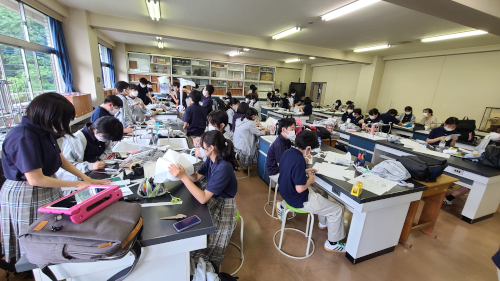 生徒たちは生卵を守るエッグプロテクターを制限時間内に紙・はさみ・セロテープのみで作ります。
