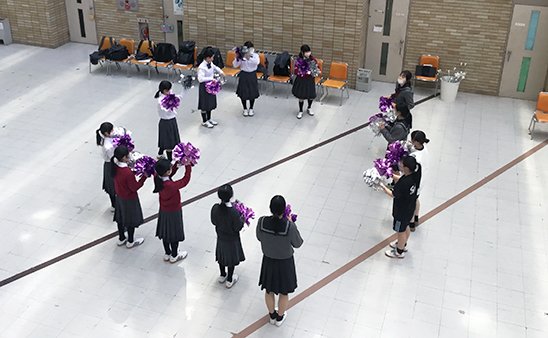 バトン部は全国大会出場を目標に元気に明るく活動しています。毎年7月には野球応援にチアダンスとして参加しています。その後8月から大会シーズンに入り、県大会、関東大会に出場し、12月には全国大会があります。さらに団体だけでなく個人のレベルアップを目指してソロコンテストや技能ライセンス講習会に挑戦しています。また、夏休みに通い合宿を行い、全国大会に向けた団体としての結束力を高めます。バトンの楽しさ、魅力を学校行事で披露することもあり、人前で演技する緊張感や達成感を部員全員で感じ、乗り越えていく力を育んでいます。